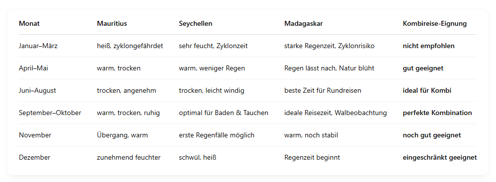 Eine Kombireise nach Mauritius, den Seychellen und Madagaskar bietet ein unvergleichliches Spektrum an Eindrücken – vorausgesetzt, Sie wählen die richtige Reisezeit. Die Monate Mai bis Oktober sind für die Kombination am besten geeignet. Während Madagaskar in dieser Zeit durch gute Straßenverhältnisse, aktive Tierwelt und angenehm milde Temperaturen überzeugt, laden die Seychellen mit ruhigem Meer und tropischer Leichtigkeit zum Genießen ein. Mauritius rundet das Ganze mit perfektem Bade- und Aktivwetter ab.