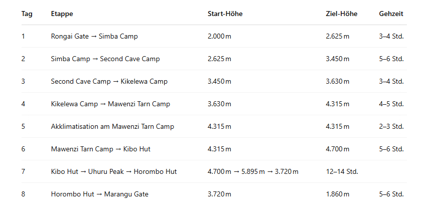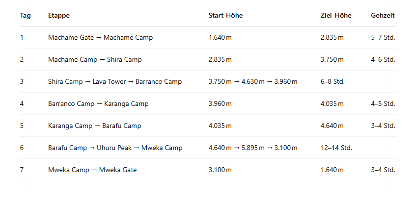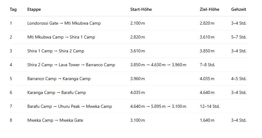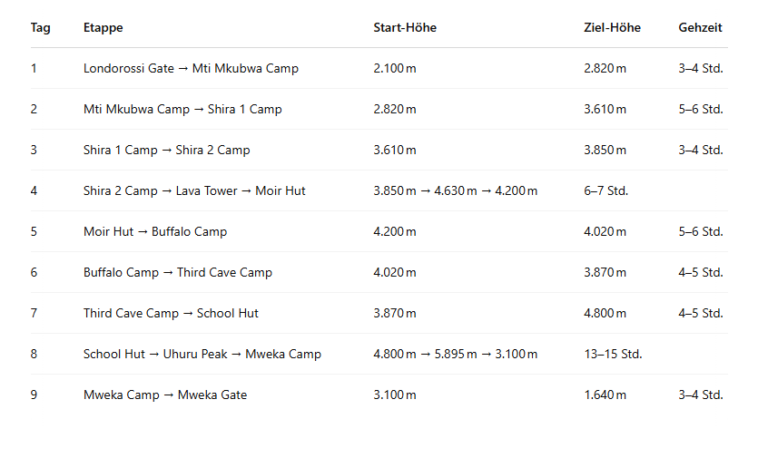 Hier finden Sie eine klare und detaillierte Übersicht über den Verlauf dieser eindrucksvollen, langen Kilimanjaro-Route:
