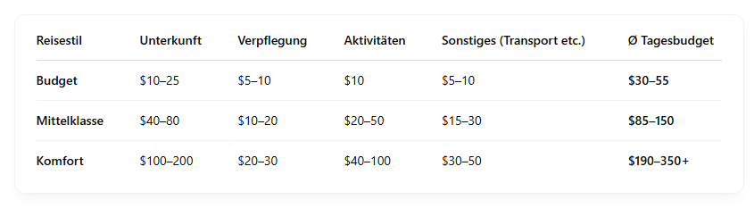 Durchschnittlicher Tagespreis für Unterkunft: $10–25 für Budget, $50–80 für Mittelklasse, $120–150 für gehobene Unterkünfte