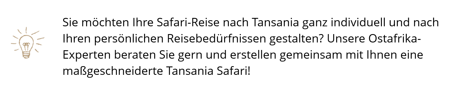 Unsere Ostafrika-Experten beraten Sie jederzeit natürlich kostenfrei und unverbindlich rund um die Planung Ihrer Tansania Safari und stellen für Sie komplett nach Ihren Wünschen und persönlichen Bedürfnissen eine Tansania-Safari zusammen. Kontaktieren Sie uns für eine Kostenaufstellung Ihrer Safari und profitierst Sie von unserem hochwertigen Service und vom besten Preis-Leistungs-Verhältnis!