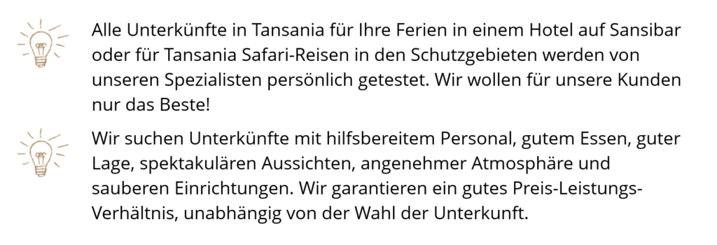 Wir können Ihnen bei jedem Aspekt Ihrer Reise helfen – von Beratung bis hin zur direkten Organisation Ihrer Safari. Alle unsere Preise beinhalten Unterkunft, Eintrittsgelder in die Nationalparks, Transfers, eine große Auswahl an Aktivitäten und Mahlzeiten. Unsere privaten Tansania Safaris sind ab 2 Person buchbar und stecken voller echter Insider-Tipps und spannender Begegnungen in der Afrikanischen Wildnis. Mit grosser Leidenschaft erarbeiten wir für Sie massgeschneiderte Reisevorschläge. Die folgenden Routen stellen Beispiele dar. Diese Beispiele soll Ihnen einen ersten Einblick über einen möglichen Reiseverlauf einer Tansania Safari geben und als Anregung zur Planung Ihrer Safari-Reise dienen. Sie können auch jede hier angebotene Tansania-Reise individuell anpassen oder Ihre Wunschreise selbst zusammenstellen.