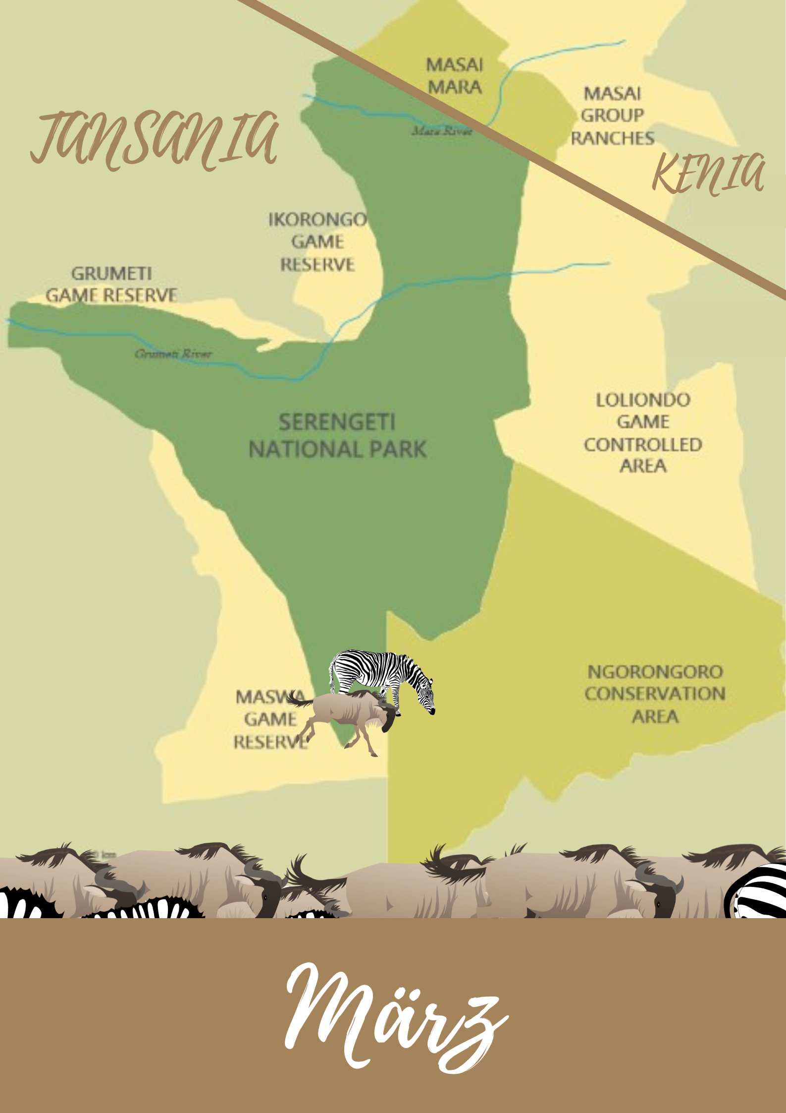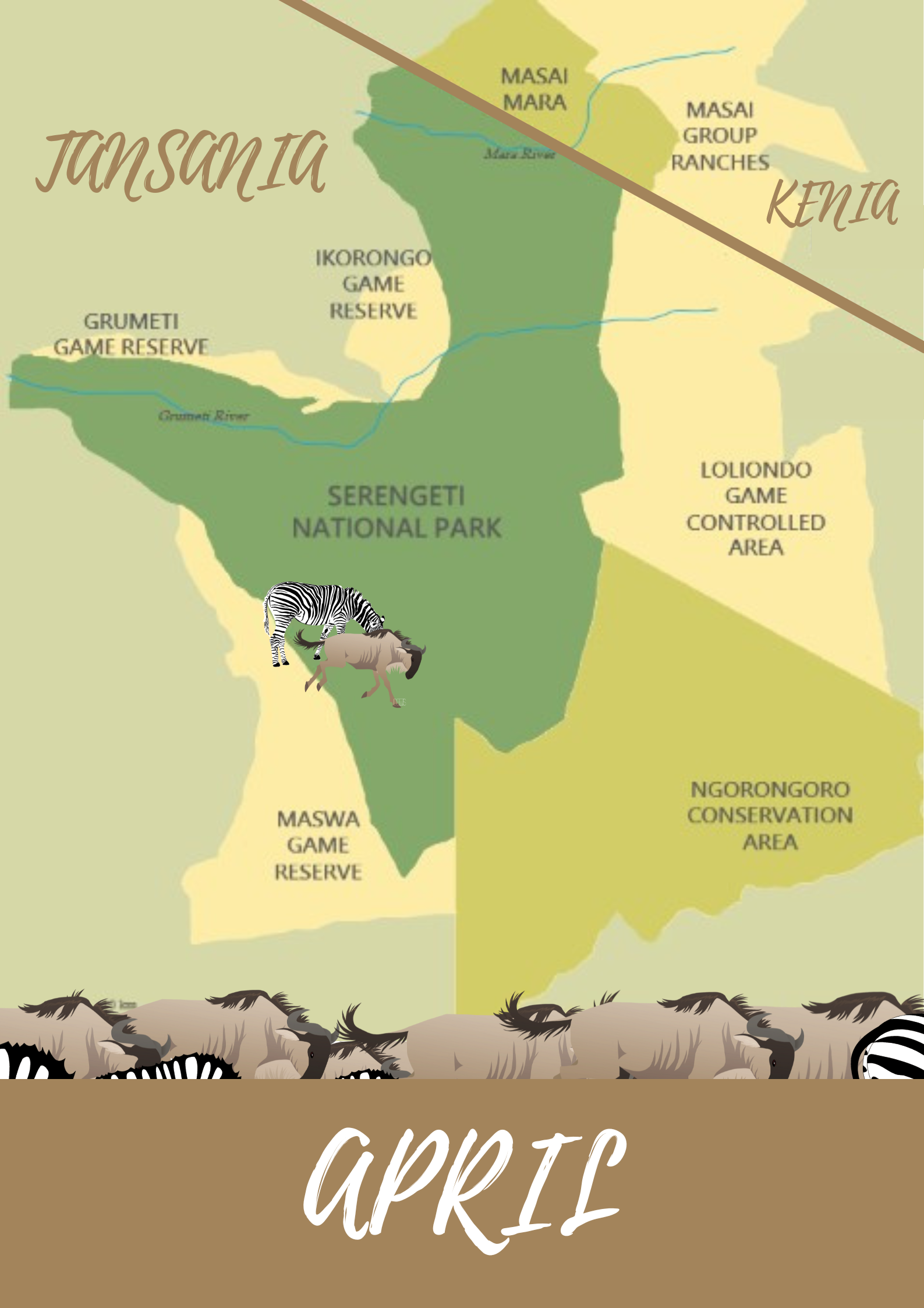 - April-Mai: Männchen konkurrieren um die Weibchen, Paarung in der westlichen und zentralen Serengeti