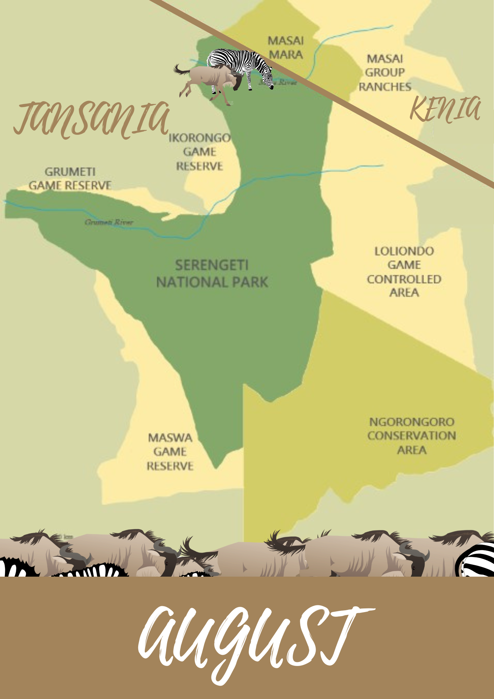 - Juli-August: Wandernde Herden, die sich über ein weites Gebiet ausbreiten im Grumeti-Reservat, Ikorongo, in der zentralen Serengeti