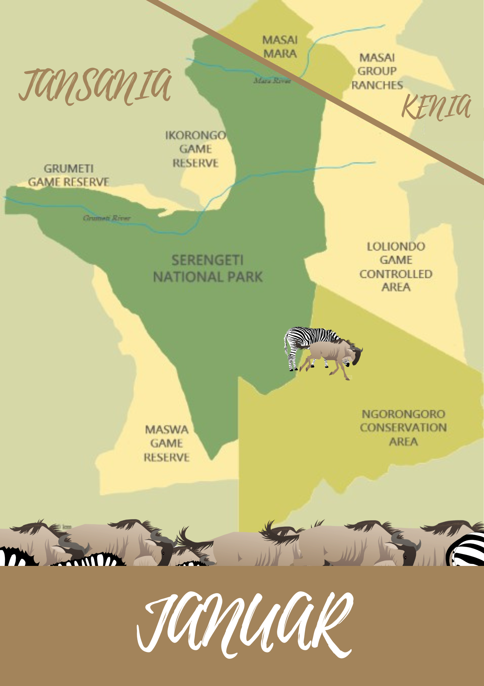 Der Beginn des Jahres fällt in die Mitte der "grünen Jahreszeit", genau zwischen dem "kurzen" und dem "langen" Regen. Die Ebenen sind wunderschön grün, die Luft ist staubfrei, und die Wildtiere sind relativ leicht zu sehen. Wenn das Gras grün wird, zieht es auch die Gnus an, die von Norden her in die südliche Serengeti, nach Ndutu, in das Ngorongoro-Schutzgebiet und in die Salei-Ebene ziehen. Am Nachmittag ist mit einigen Schauern zu rechnen, die jedoch nur kurz anhalten und die Pirschfahrten in der Regel nicht beeinträchtigen. Die Temperaturen erreichen im Durchschnitt 28°- 15°C . Der Januar ist ein warmer Monat, und andere Wildtiere sind leichter zu entdecken, da die Vegetation weniger üppig ist. Die Tiere versammeln sich oft an Flüssen und Wasserlöchern.