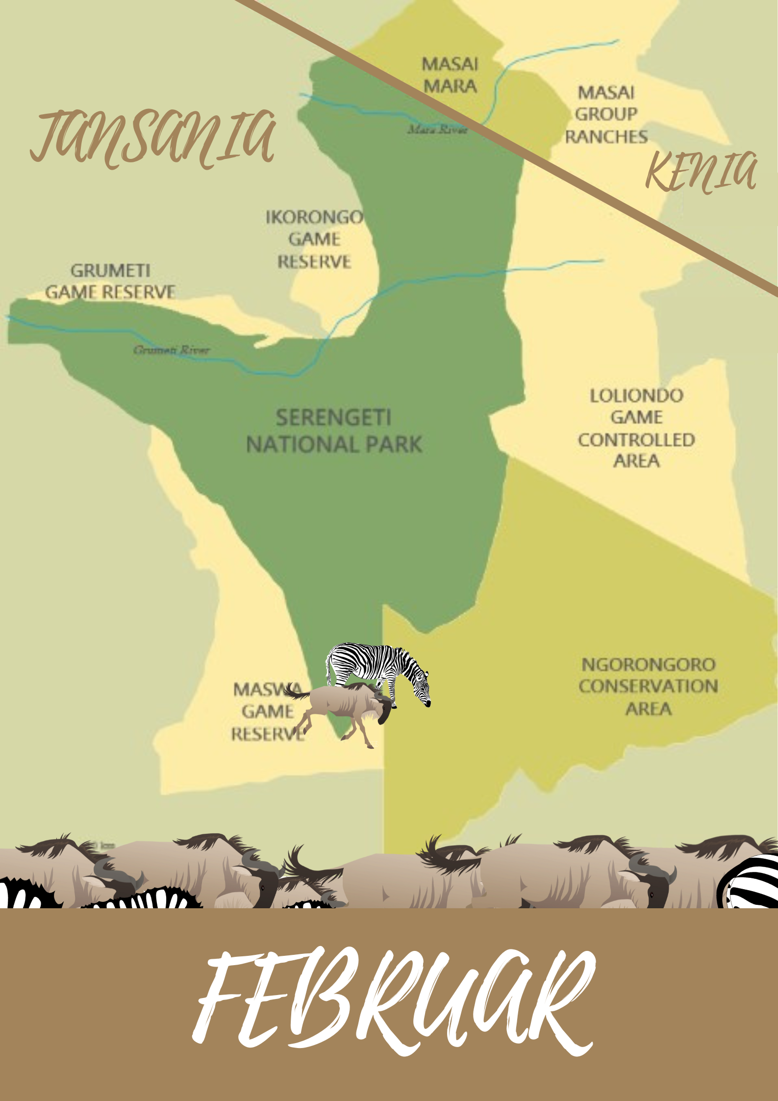Im Februar versammelt sich der Großteil der Herde in den Ndutu-Ebenen im Ngorongoro-Schutzgebiet großen Gnu- und Zebraherden. Der Februar liegt in der Regel vor der Regenzeit (genauer gesagt vor dem "langen Regen", der normalerweise im März einsetzt), die Schauer sind sporadisch und stellen normalerweise keine große Beeinträchtigung während der Pirschfahrten dar.