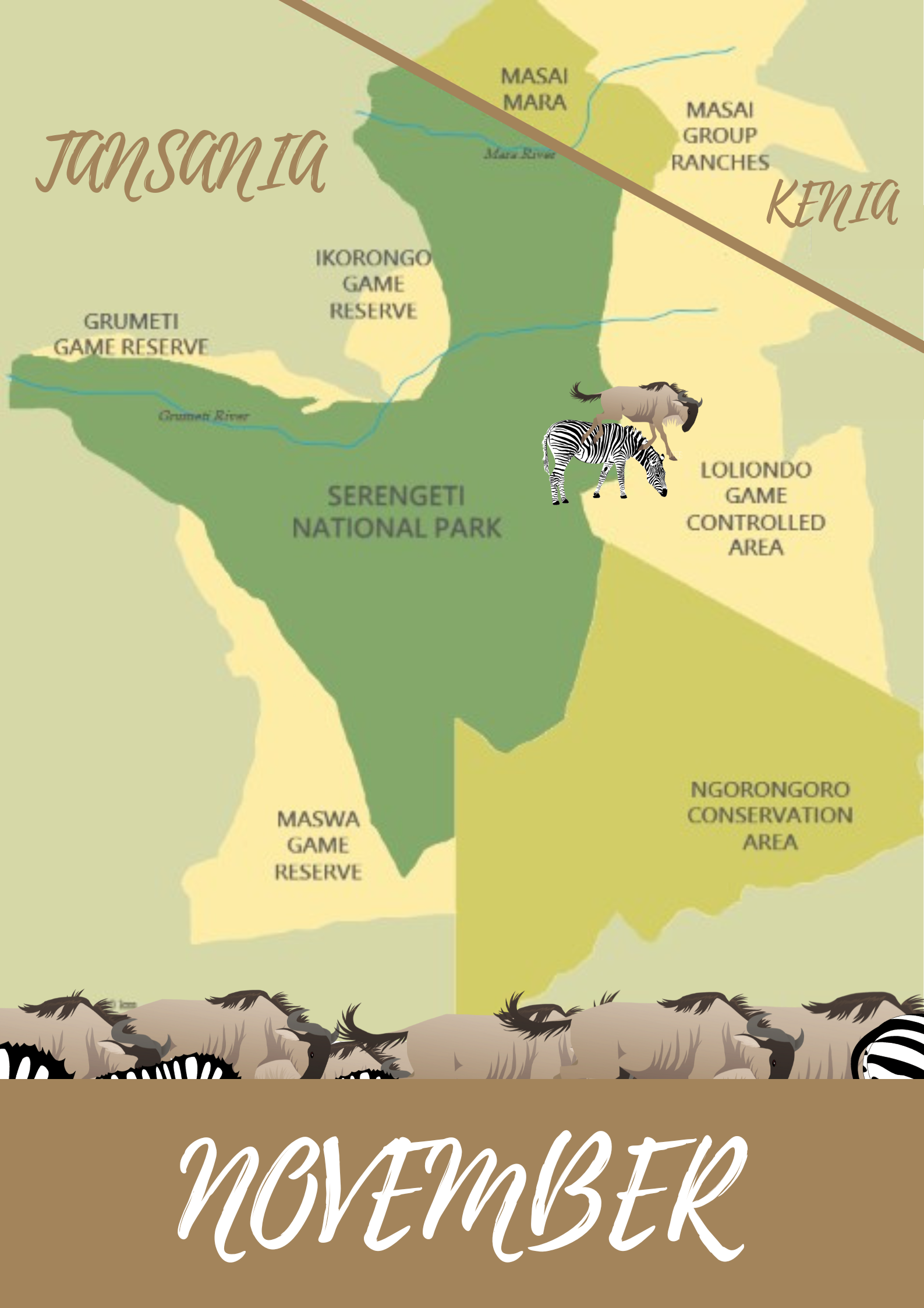 - November-Dezember: Herden kommen Ende November in die südliche Serengeti an