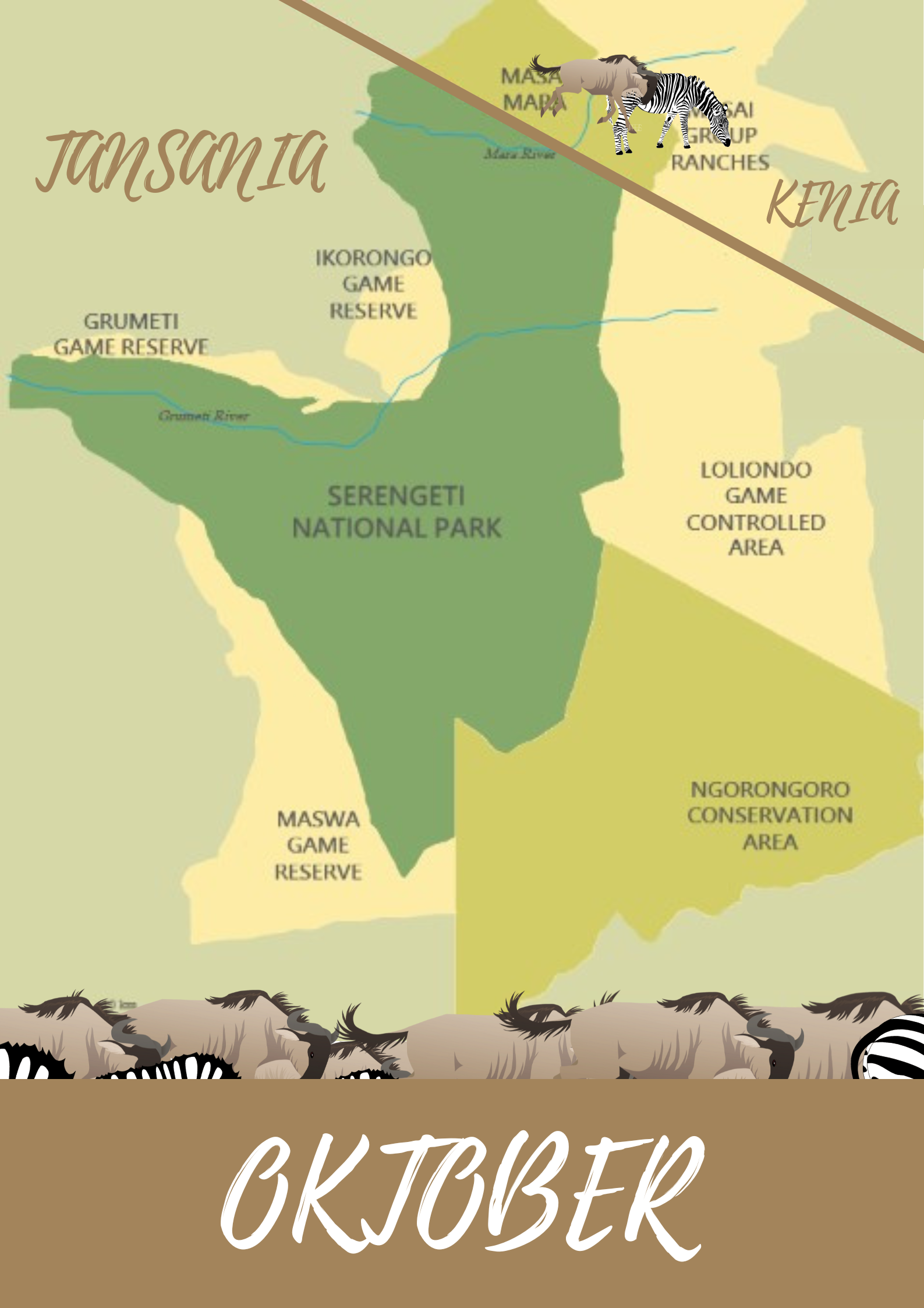 - Oktober: Herden befinden sich im westlichen Loliondo und Lobo-Gebiet des Serengeti-Nationalparks und ziehen langsam in die südliche Serengeti